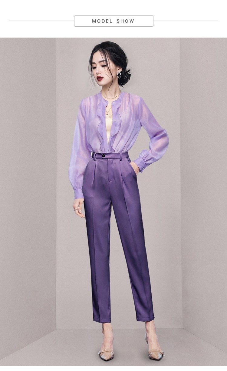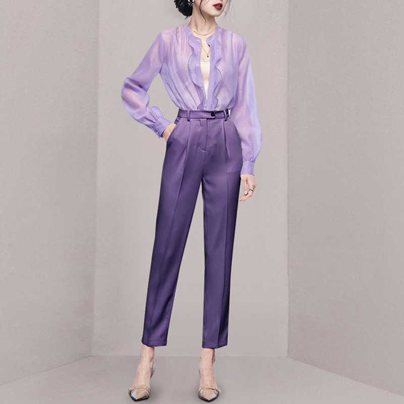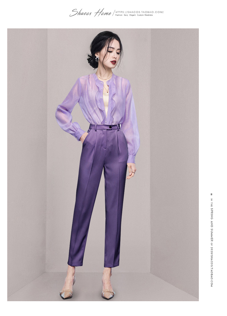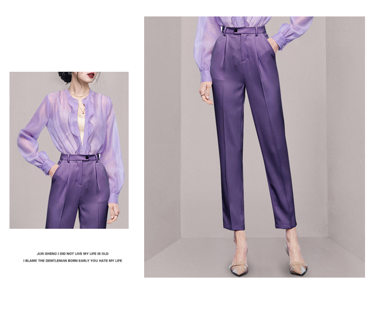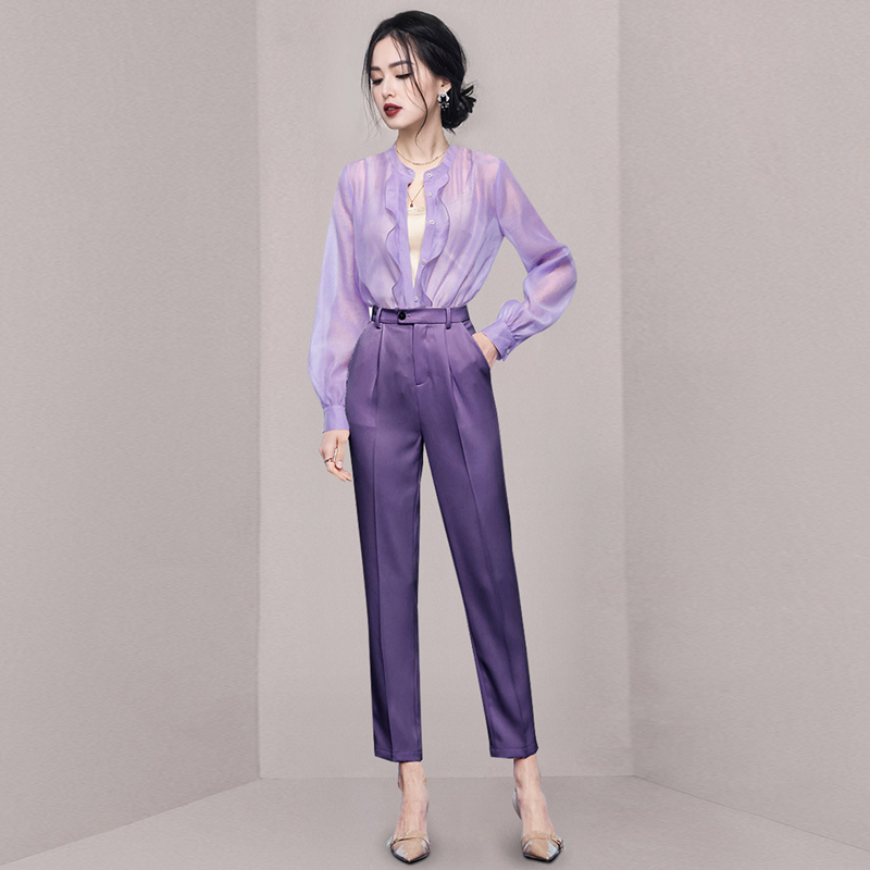 欧货套装女秋装高级感紫色荷叶边长袖衬衫高腰直筒九分裤子两件套 举报